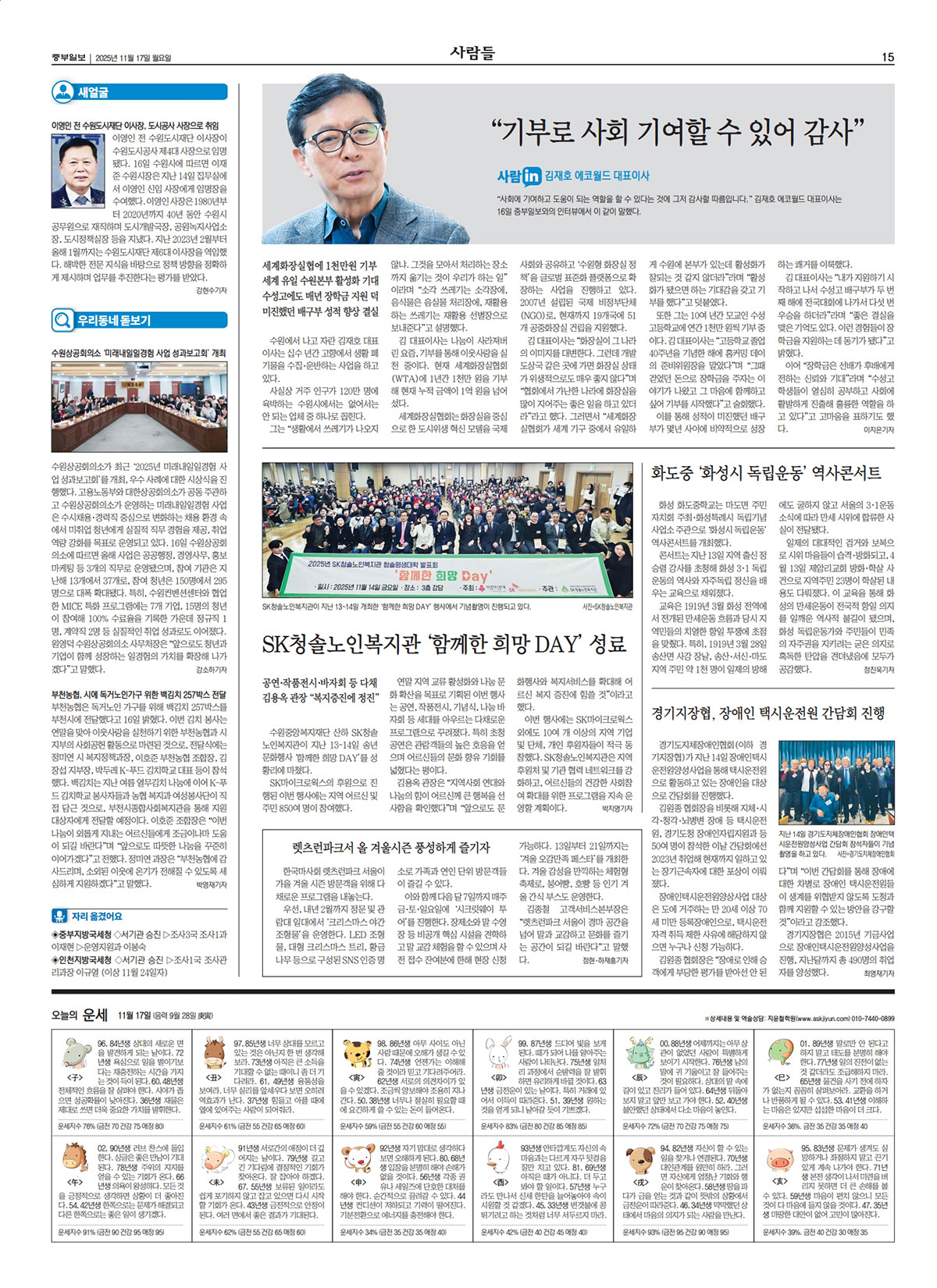 수원상공회의소 원영덕 사무처장은 “청년들이 미래내일일경험 사업을 통해 자신의 잠재력을 발견하고 다양한 역량을 쌓는 기회가 되길 바란다”며 “앞으로도 청년과 기업이 함께 성장하는 일경험의 가치를 확장해 나가겠다”고 말했다. [언론 보도] 11월17일 조간 지면 경인일보 11월17일 조간 지면 인천일보 https://www.incheonilbo.com/news/articleView.html?idxno=1309005 중부일보 11월17일 조간 지면