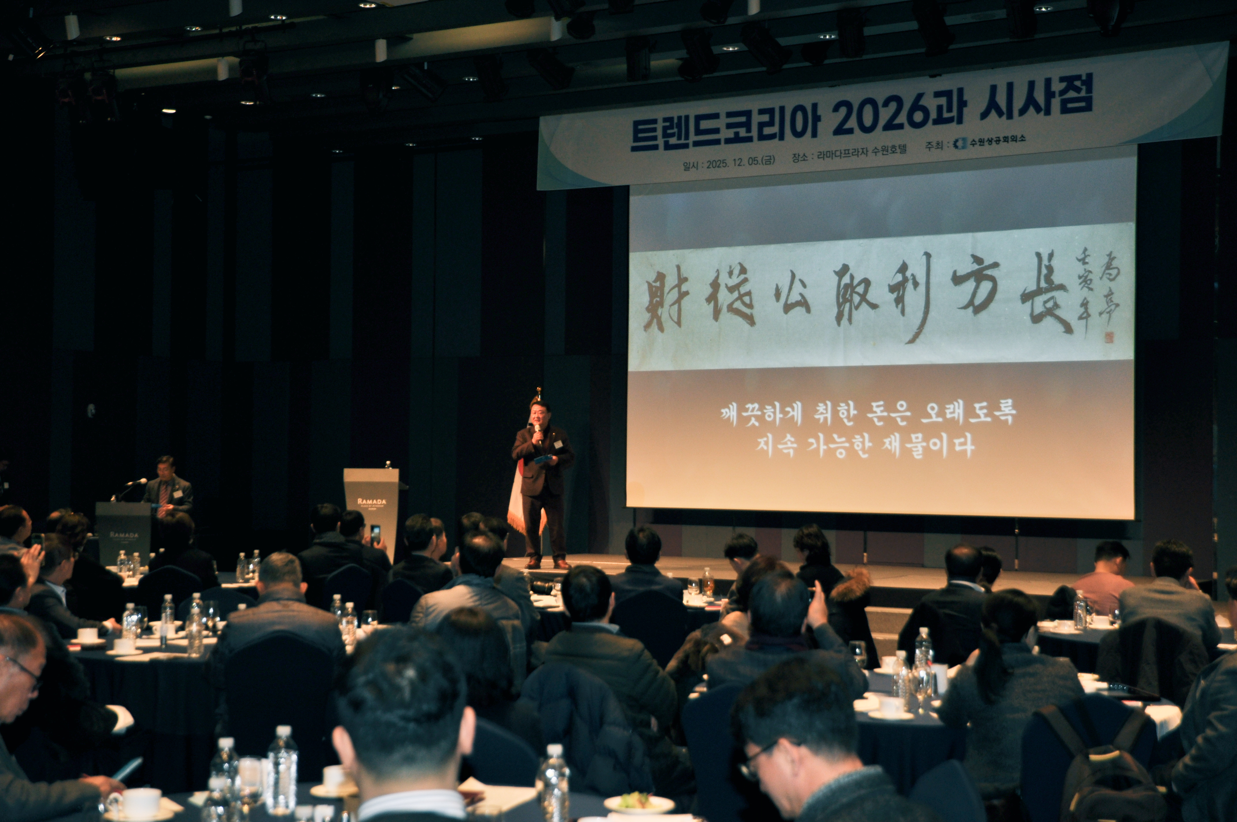 수원상공회의소는 12월 5일 라마다프라자 수원호텔에서 상명대학교 교수이자, 「트렌드코리아」공동저자인 이준영 교수를 초청해 「트렌드를 알면 소비패턴이 보인다」라는 주제로 조찬강연회를 개최했다.