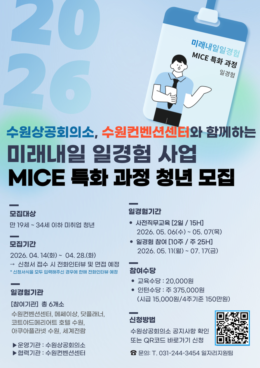 ★ 모집기간 연장(~2026.04.28) ★MICE 특화 1기[모집] 2026년 미래내일일경험사업 참여청년 모집 안내수원상공회의소는 MICE(전시·컨벤션) 분야 미취업 청년을 대상으로 직무교육 및 인턴십 경험을 제공하는 「2026년 미래내일 일경험(인턴형) MICE 특화 1기」참여 청년을 모집합니다. 많은 관심과 참여 바랍니다. ![]() 1. 모집 대상 만 20세 ~ 만 34세 이하 미취업 청년