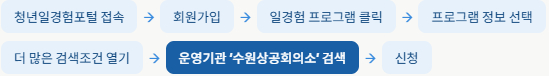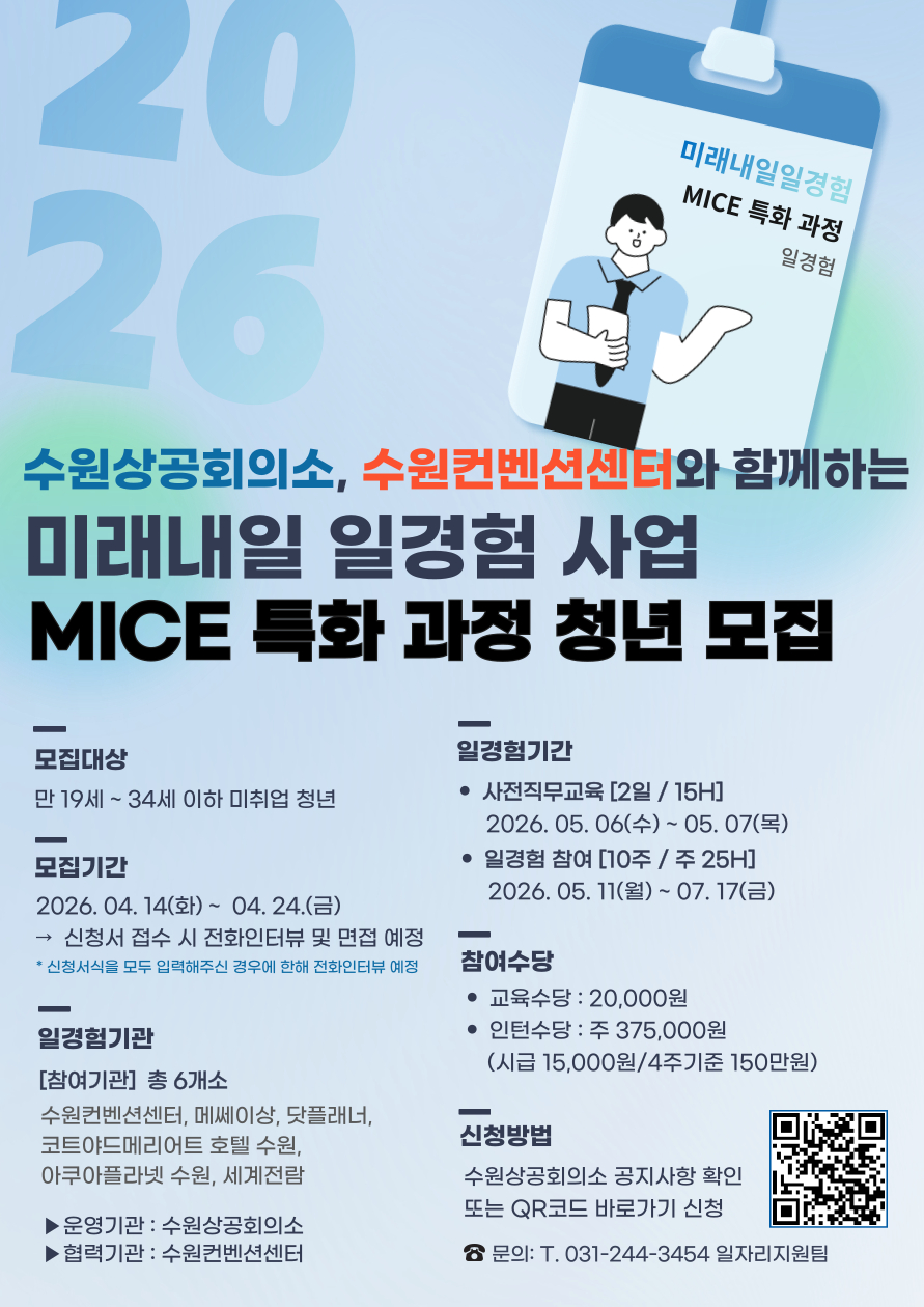 MICE 특화 1기[모집] 2026년 미래내일일경험사업 참여청년 모집 안내수원상공회의소는 MICE(전시·컨벤션) 분야 미취업 청년을 대상으로 직무교육 및 인턴십 경험을 제공하는 「2026년 미래내일 일경험(인턴형) MICE 특화 1기」참여 청년을 모집합니다. 많은 관심과 참여 바랍니다. ![]() 1. 모집 대상 만 20세 ~ 만 34세 이하 미취업 청년