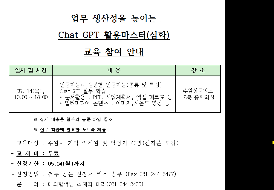| 제목 | 업무 생산성을 높이는 Chat GPT 활용마스터(심화) 교육 참여 안내 | ||