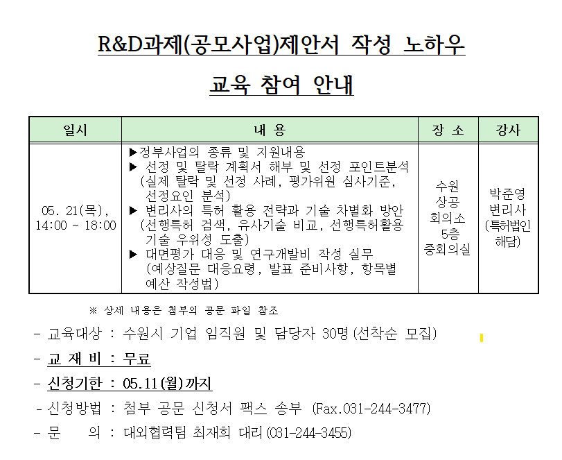 | ‒ | R&D과제(공모사업) 제안서 작성 노하우교육 참여 안내 |